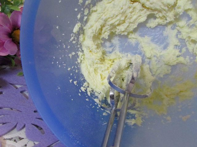 Взбить до белой массы сахарную пудру и сливочное масло.