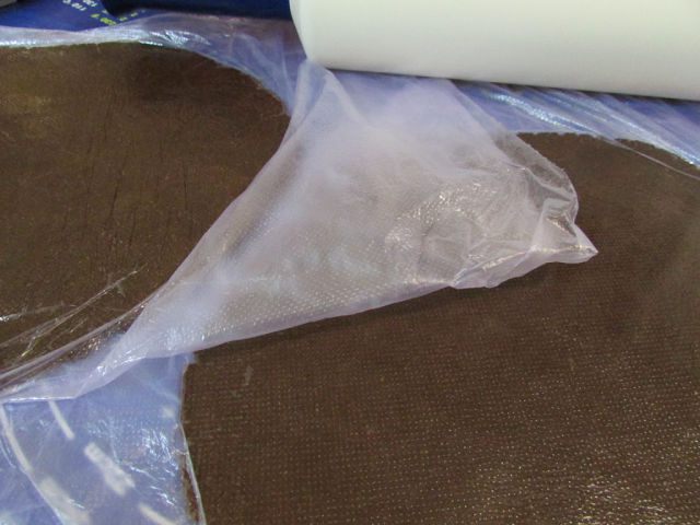 Положить тесто в целлофановый мешок и раскатать в тонкий пласт, 4-5 мл (я разделила тесто на две части). И в таком виде отправить тесто в холодильник на 2 часа.