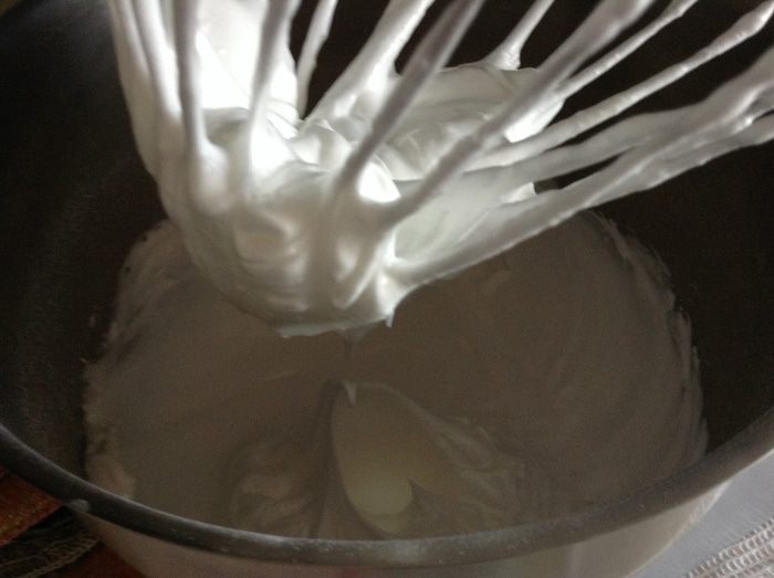 Всыпать сахар и взбивать еще несколько минут до гладкой, плотной, блестящей, белоснежной пены.