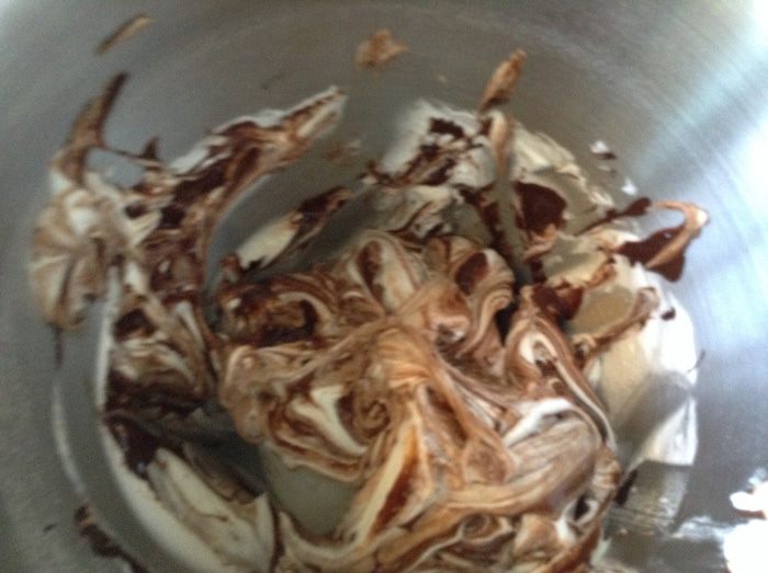 Шоколад должен остыть до 40-30 градусов. Аккуратно переложить шоколад в белки и 3-5 движениями все смешать ( очень аккуратно!!!! ).