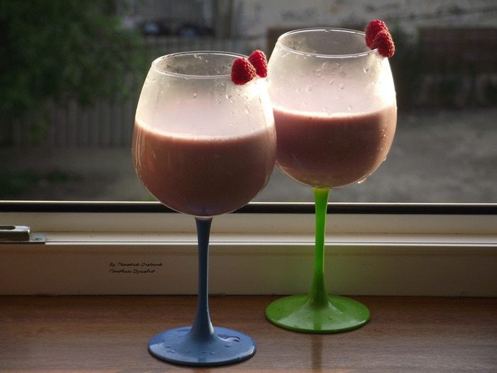 Бокалы отправляем в морозильную камеру охладиться. Малину взбиваем в блендере с сахаром или медом. Затем уменьшаем обороты миксера и тонкой струйкой вливаем молоко. Взбиваем около 1 минуты. Затем увеличиваем обороты и добавляем мороженое. Взбиваем до 3-х минут на максимальной скорости.