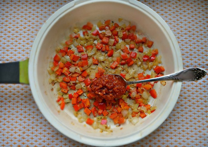 Посолите, приправьте перцем, щепоткой сухой мятой и базиликом, добавьте 1 ст. л. томатного соуса или 0,5 ст. л. пасты. Я использую томатную приправу собственного приготовления, кому интересно, можете заглянуть сюда https://www.edimdoma.ru/retsepty/57836-priprava-iz-ovoschey-nezamenimaya-i-vkusnaya-zagotovka-na-zimu