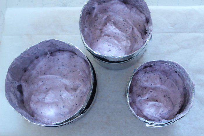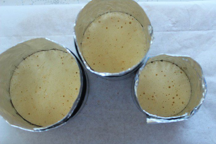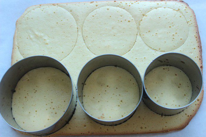 Я собирала тортики в вырубках, предварительно сделав в них бортики из фольги. На дно каждой формы положить бисквитное кольцо