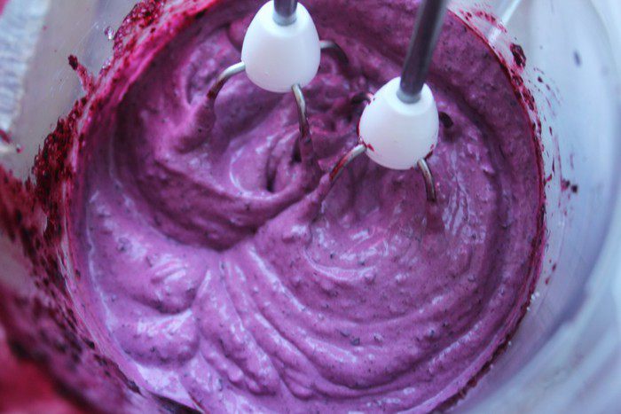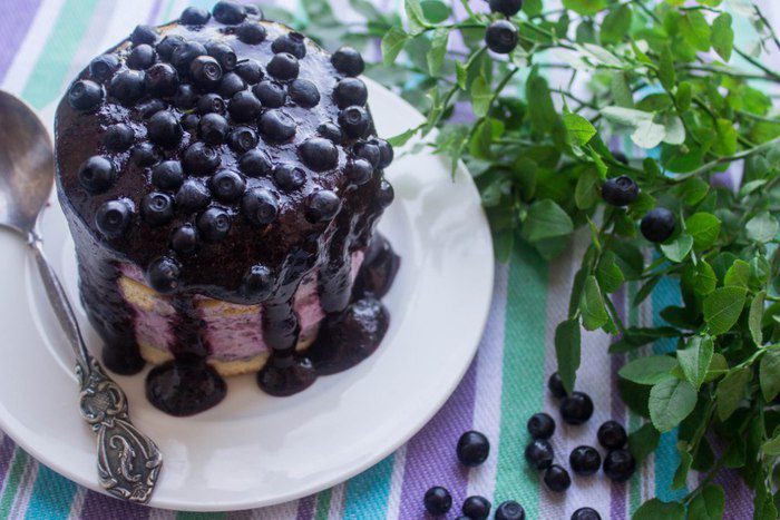 Чернику помыть, обсушить и пюрировать при помощи блендера. (Немного ягод оставить для украшения целыми) Добавить сахар и взбить. Часть пюре (3 ст.л.) оставить для глазури.