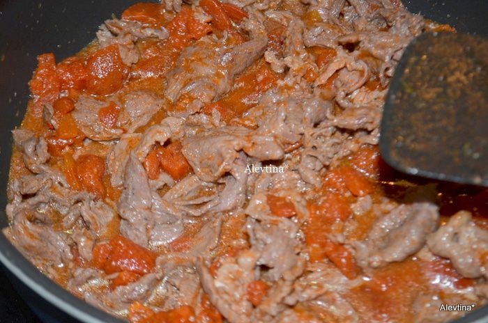 Разогреть сковороду, вылить 2 стол.л масла. Выложить кусочки мяса со специями, приправа идет итальянская (смесь). Обжаривать примерно 5 мин.