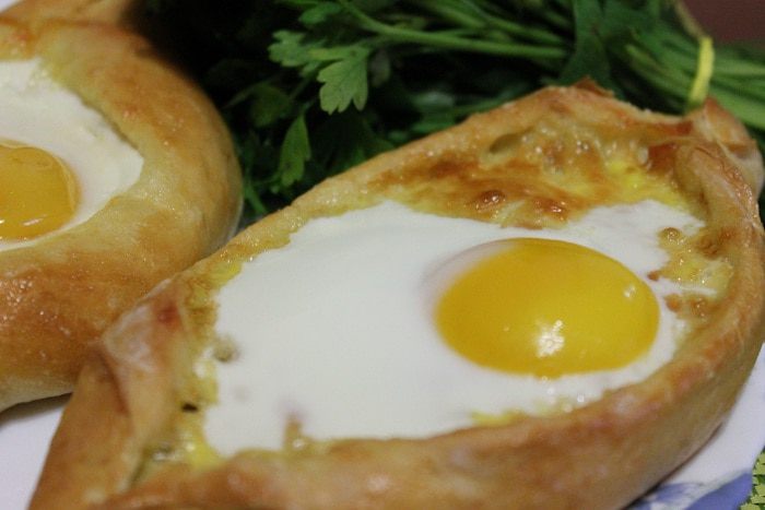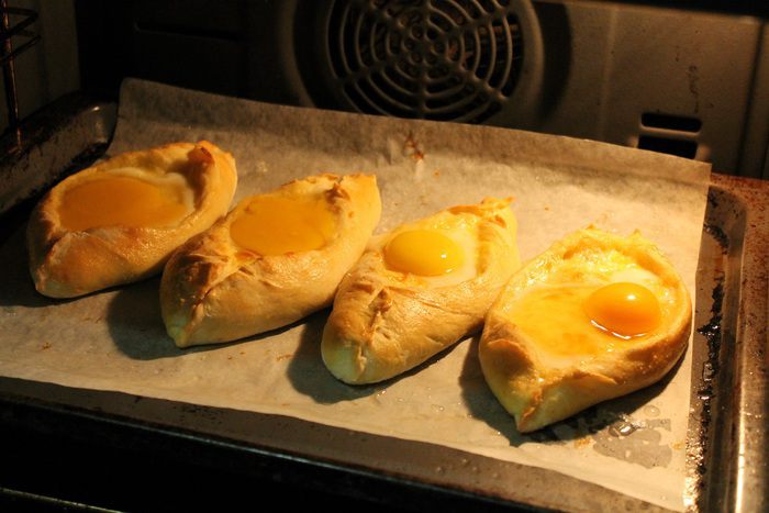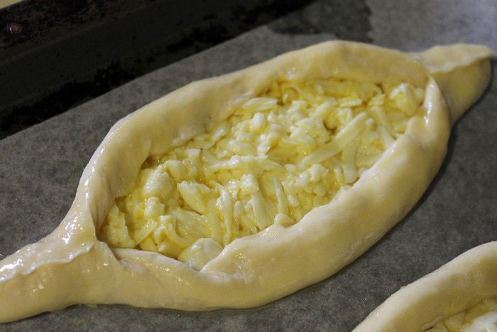 Завернуть края теста вверх, чтобы получились "лодочки". Переложить хачапури на застеленный пергаментом и смазанный маслом противень. Одно яйцо размешать в миске и смазать им бортики хачапури.