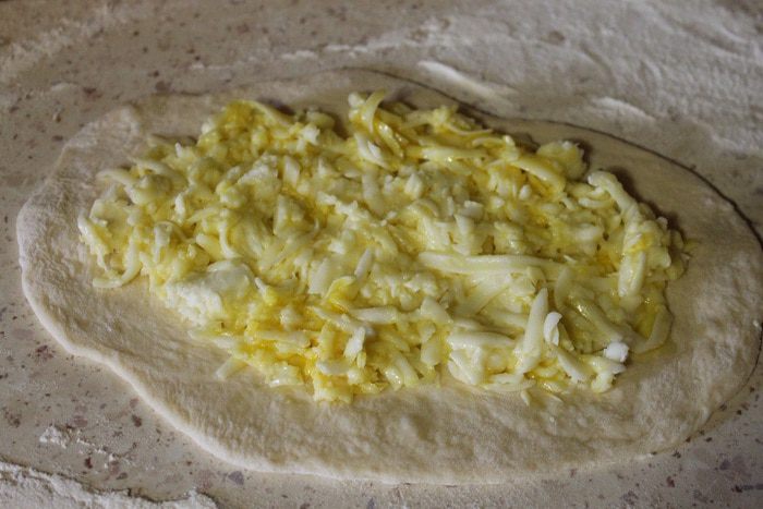 Тесто разделить на 7 равных частей, раскатать скалкой в пласты, придав форму больших овалов. На каждый овал выложить равное количество начинки, оставив свободными края.
