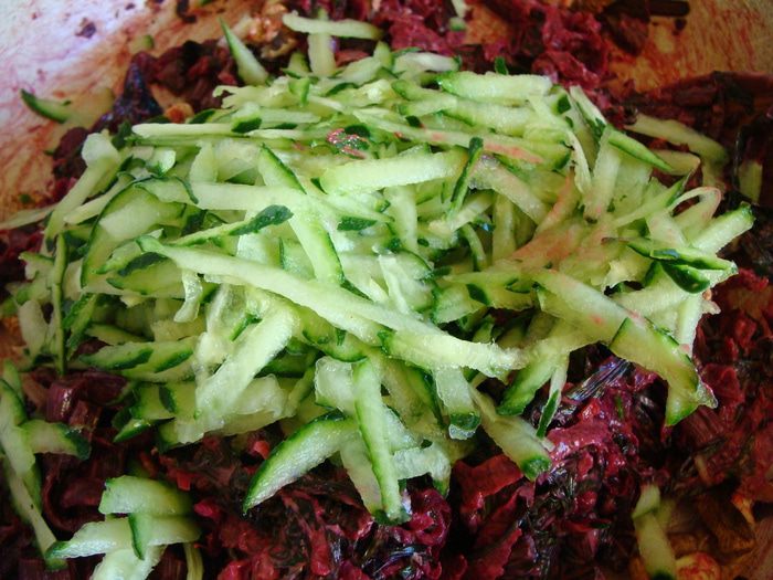 Добавить специи, натертый свежий огурец и грецкие орехи. Заправить сметаной.