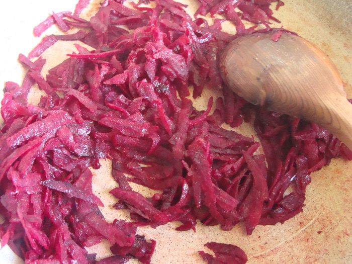 Свеклу натереть на крупной терке. Пассеровать на медленном огне около 10 минут.