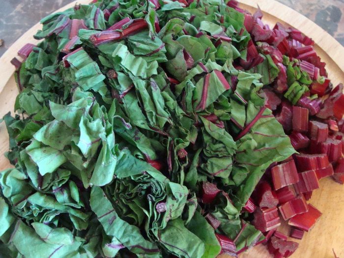 Листву свеклы порубить. Добавить на сковороду. По необходимости добавить оливковое масло. Пассеровать еще минут 10 на слабом огне. Остудить.