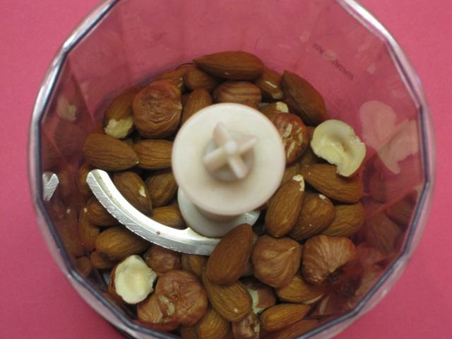 Орехи, я взяла миндаль и фундук, очистить, выложить в блендер.