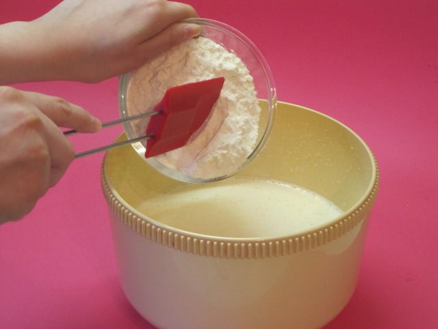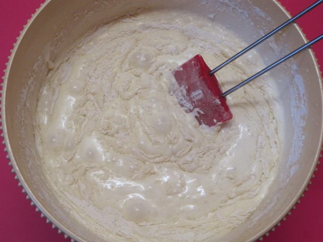 Всыпать 200 грамм просеянной муки( остальные 20 грамм нужны для заварного крема) с разрыхлителем.