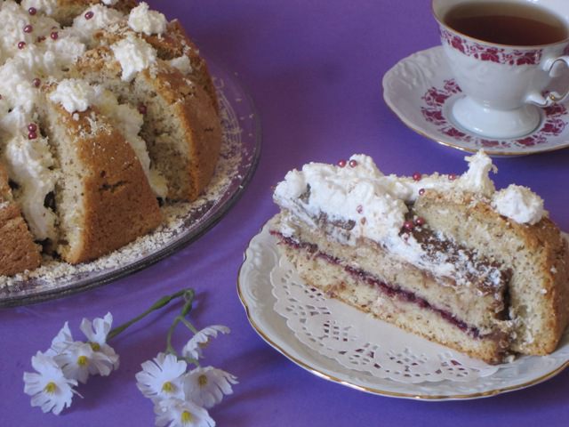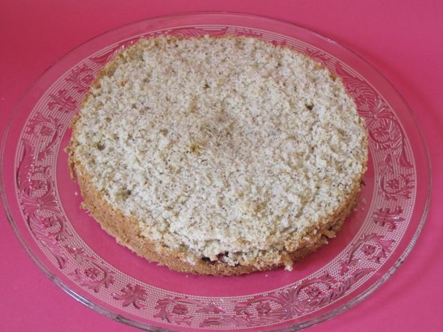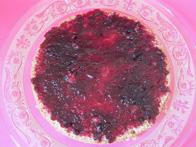 Теперь надо собрать торт. Нижний корж надо смазать джемом. У меня был черносмородиновый джем.