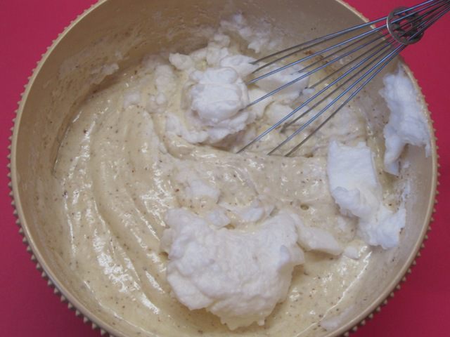 Аккуратно подмешать к желтковой массе. Лучше делать венчиком.