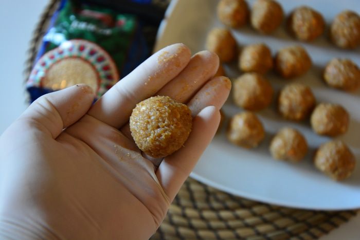 Слепить шарики. Для этого лучше одеть тоненькие перчатки и смочить руки в холодной воде.