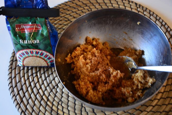 К киноа добавить арахисовую пасту, перемешать. У меня паста с орешками (Extra crunchy peanut butter).
