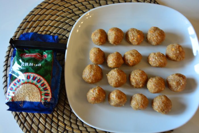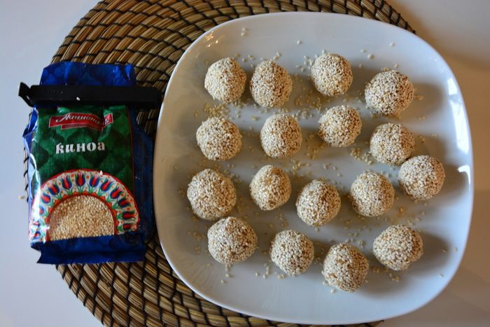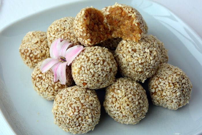 Обвалять шарики в кунжуте и убрать в морозильник на 10 минут.