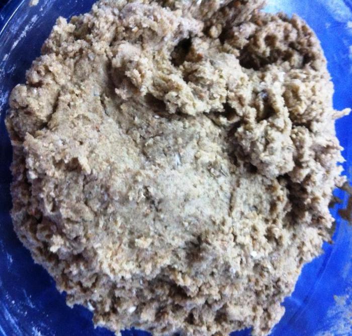 Муку, соль и разрыхлитель смешать. По рецепту необходима была пшеничная мука. К моему сожалению, у меня дома оказалось только 300 грамм, из 550 необходимых. Было уже слишком поздно бежать в магазин и я добавила 250 грамм смеси для выпечки ржанного хлеба, о чем потом не пожалела.