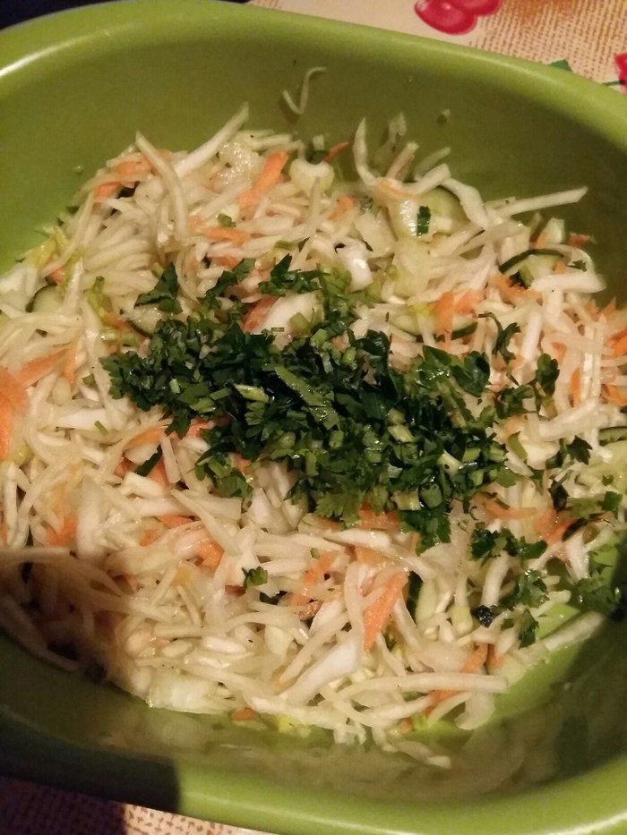Порезать зелень и добавить к остальным овощам.