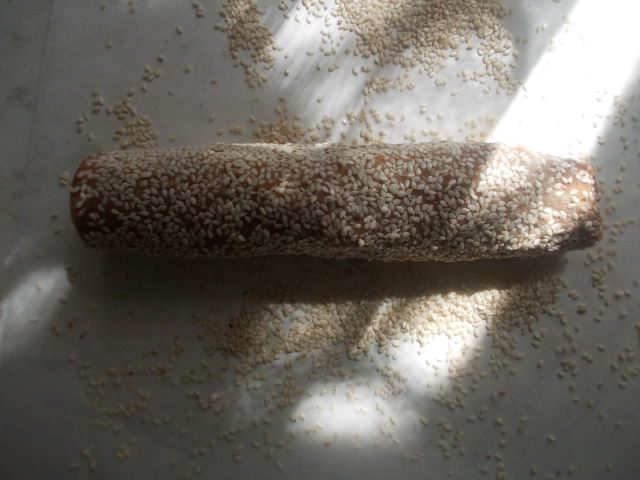 Достать тесто,обвалять в кунжуте,как-бы вжимая его и вдавливая.