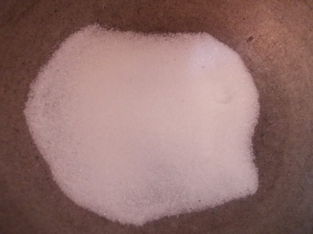 Сахар высыпать в кастрюлю с толстым дном и поставить на медленный огонь,подождать пока она расплавится и появится золотистый цвет.
