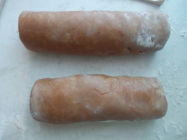 Делим тесто на две части и делаем колбаски. Заворачиваем в пленку и отправляем на несколько часов в холодильник,можно на ночь.