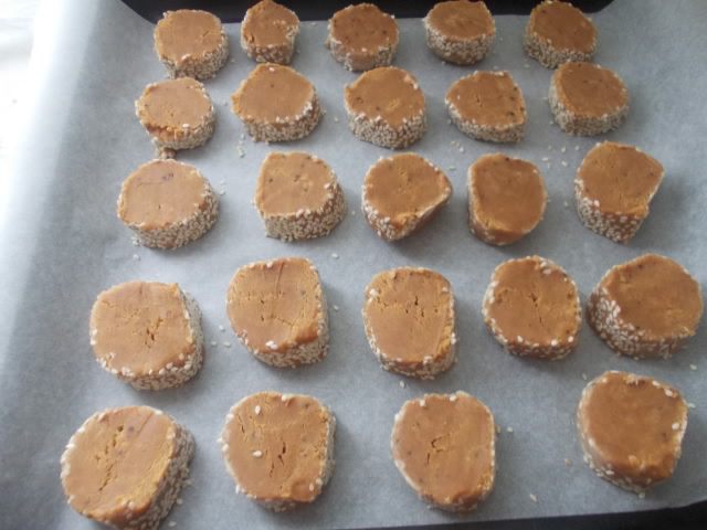 Порезать его на колечки около 1-1.5 см и выложить на противень с пергаментом,убрать в холодильник,а лучше в морозильник,минут 20-25. Тем временем включить духовку для разогрева 180С. Выпекать печенье 20 минут.