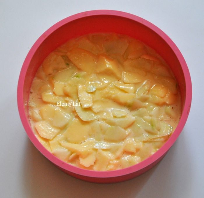 Добавить к тесту. Тесто выложить в форму, у меня силиконовая 20 см в диаметре. на дно я положила круг из пергамента, т.к. пирог очень нежный и доставать его, чтобы не поломать, надо очень аккуратно!
