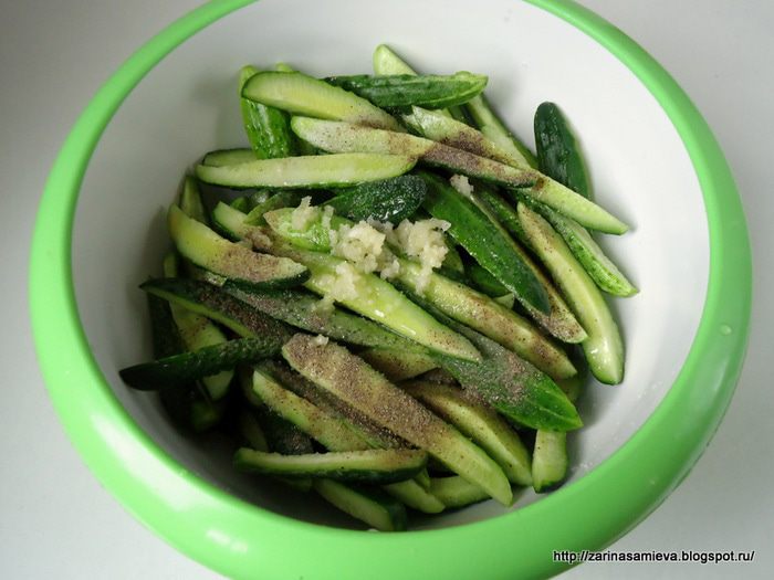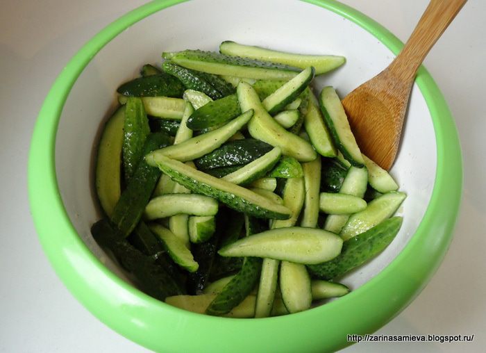 Огурцы перемешать и оставить их на 2 часа, прикрыв полотенцем. Периодически помешивать. За это время огурцы пропитаются заправкой и дадут собственный сок.