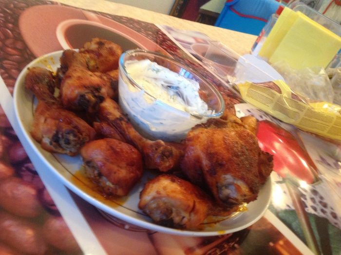 Я подавала курицу с белым соусом: смешайте майонез и сметану в равных пропорциях, добавьте мелко рубленную зелень и чеснок по вкусу.