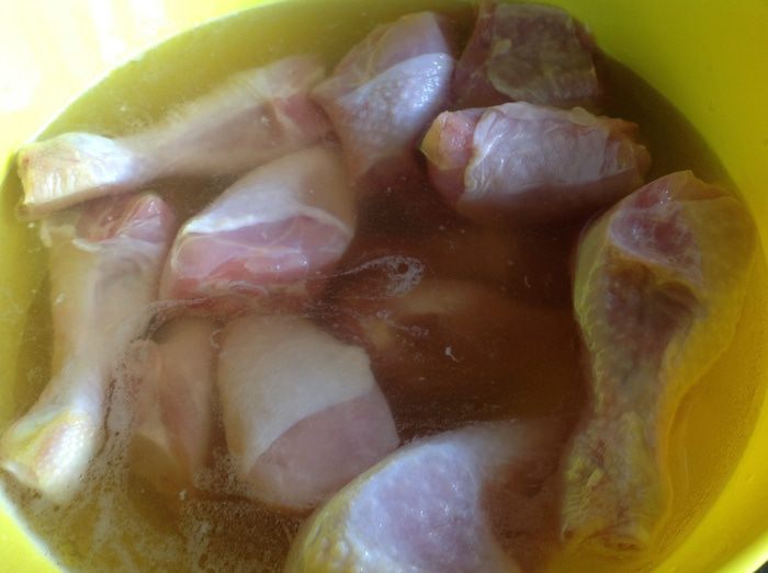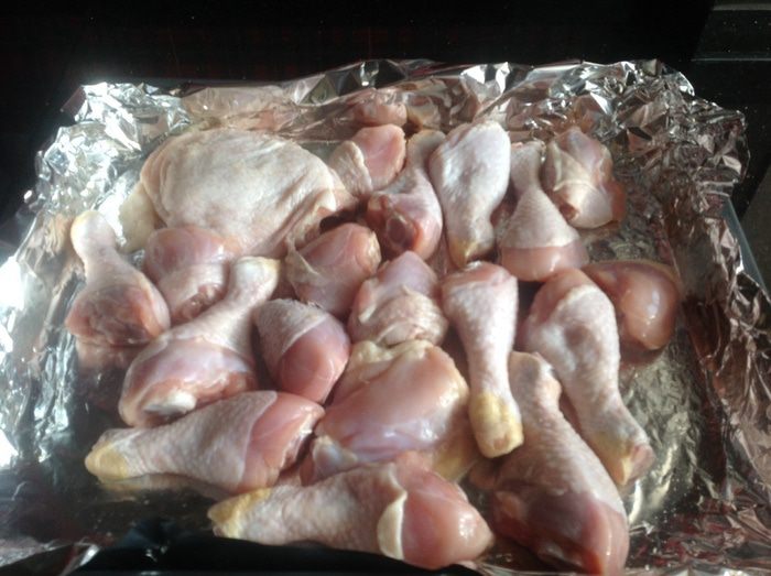В этом рецепте, по просьбе моих мужчин, я использовала куриные ножки и бедра, общим весом 2,8 кг. Соль нужна крупного помола, стакан 250 мл.
