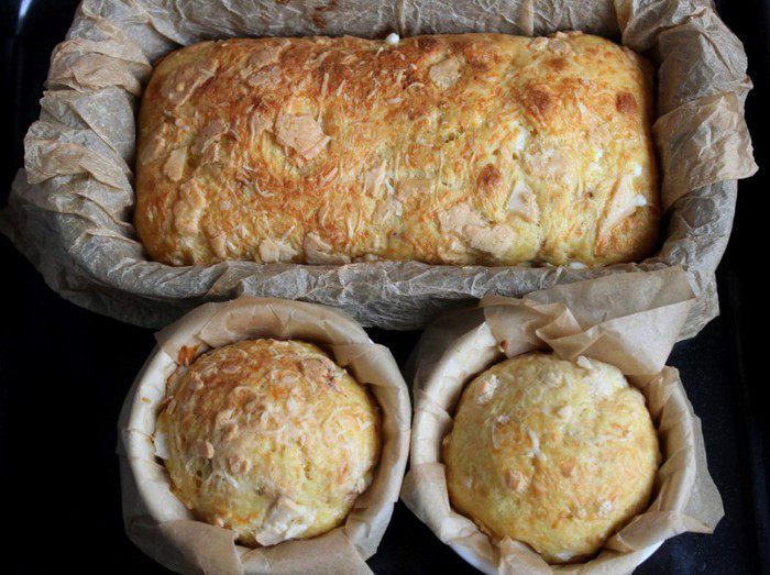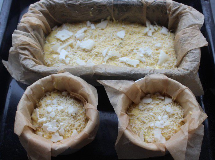 Выложить тесто в форму для запекания. Сверху посыпать тертым сыром (у меня смесь Джюгаса и козьего)