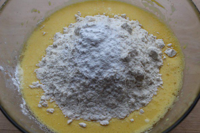 Муку просеять с разрыхлителем и солью и постепенно добавить в основную массу.