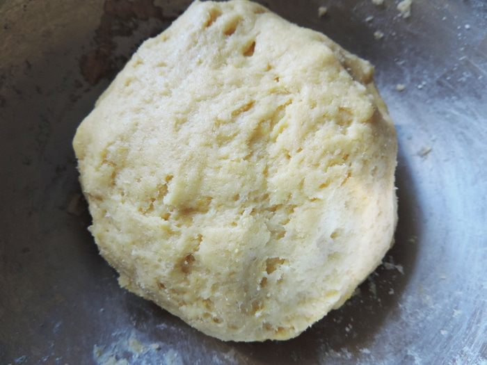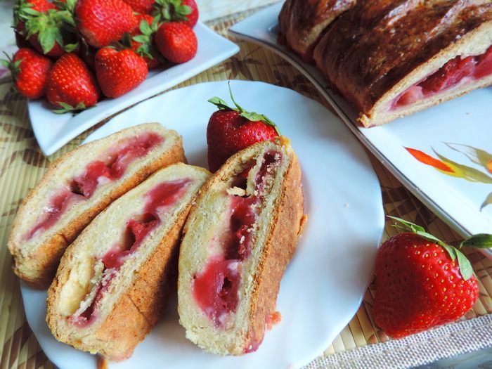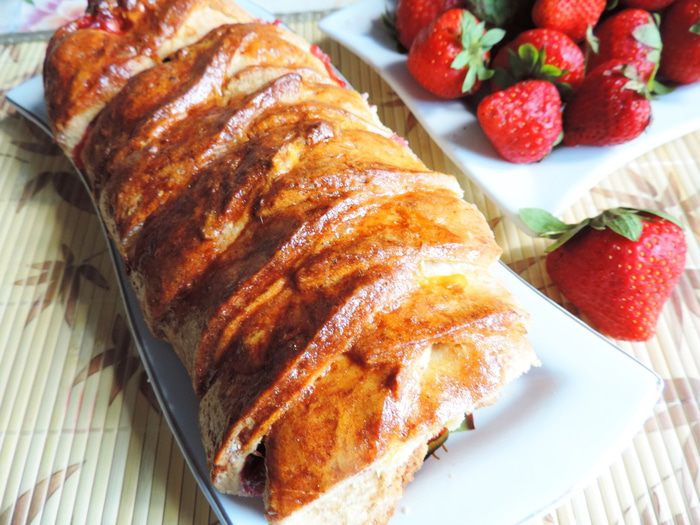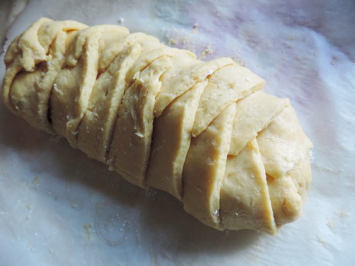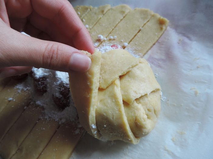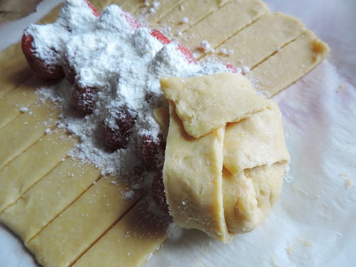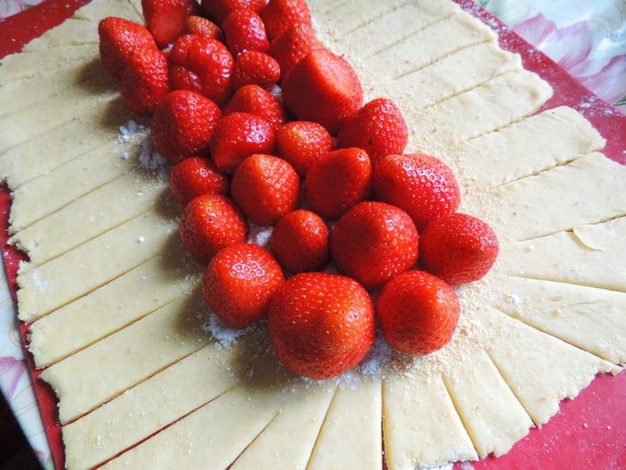 Готовое тесто делим на две части, каждую раскатываем в прямоугольный пласт толщиной меньше сантиметра. По краям пласта острым ножом делаем надрезы шириной около 1,5 см и длинной 7-8 см. Середину каждого пласта посыпаем столовой ложкой белых молотых сухарей (можно воспользоваться панировочными, но попробуйте их, чтоб убедиться, что они не из ржаного хлеба). Высыпаем примерно 1/4 часть сахарно-крахмальной смеси и выкладываем клубнику носиками вверх.