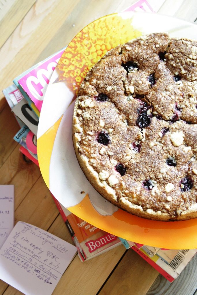 В подготовленную форму, диаметром 22см, смазанную маслом или смоченную водой (для силикона), выкладываем 2/3 крошки. Затем начинка. И оставшаяся крошка. Сверху "утопить" оставленные ягодки.