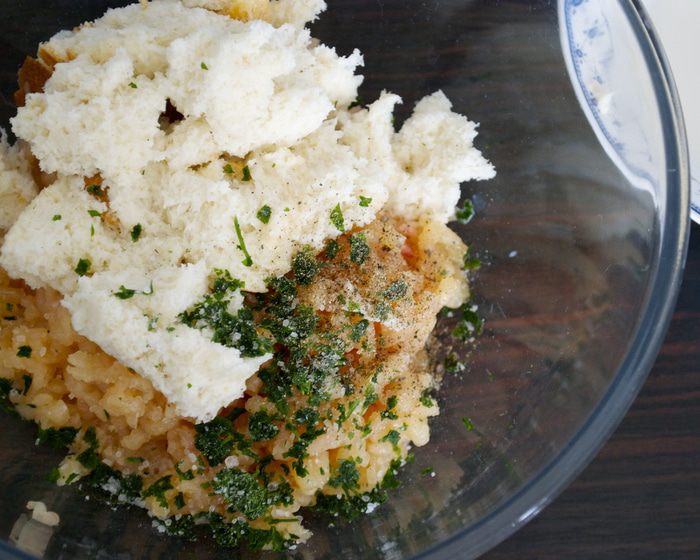 Подготовить фарш. Для этого пропустить куриное мясо через мясорубку (или измельчить в блендере), добавить отжатый от молока хлеб, 2 ст.л. тертого сыра пармезан, соль и измельченные петрушку и розмарин. Как следует все перемешать.