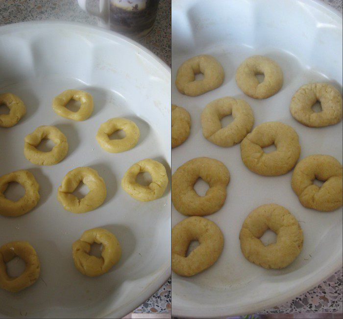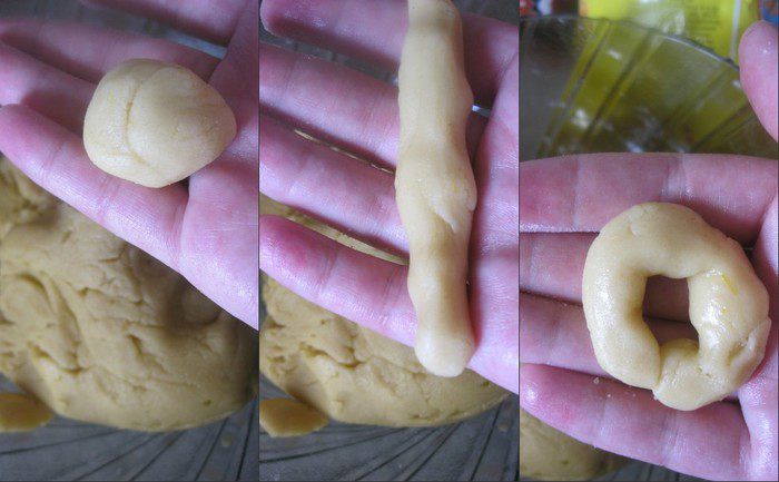 Разделить тесто на небольшие кусочки и каждый скатать в тонкую колбаску. Сформировать колечки, закрепив края.