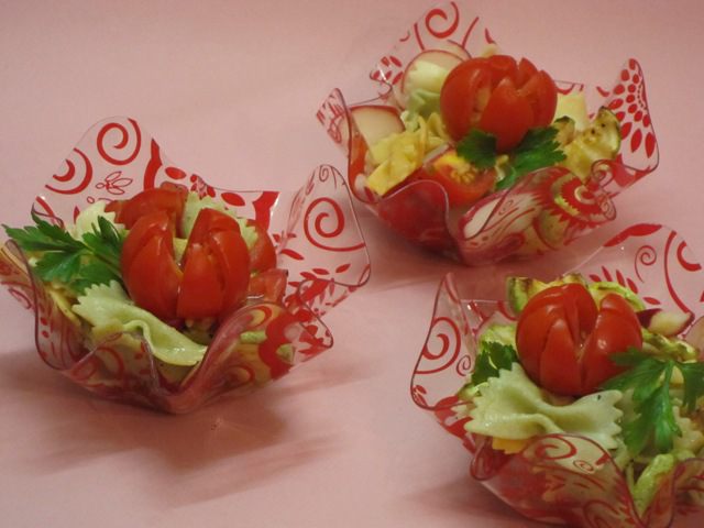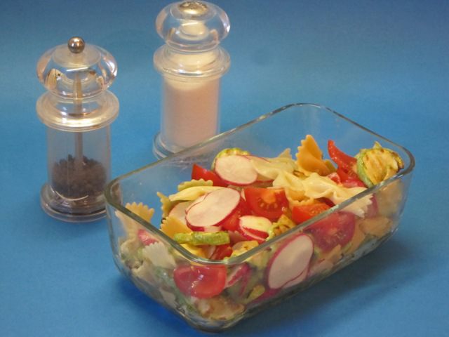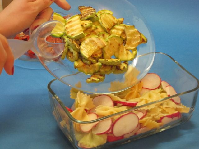 Легкий летний салат. Такой салат можно подать и горячим. В этом случае макароны промывать не надо, их нужно сразу перемешать с небольшим количеством растительного масла и добавить в салат. Обжаренный кабачок смешать с салатом еще горячим.