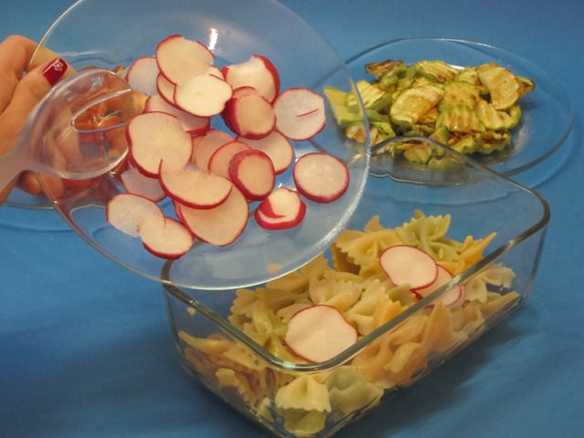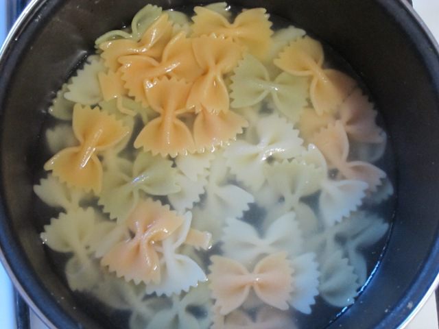 Отварить "бабочки" в подсоленной воде с добавлением оливкового масла. Откинуть на дуршлаг и промыть холодной водой.