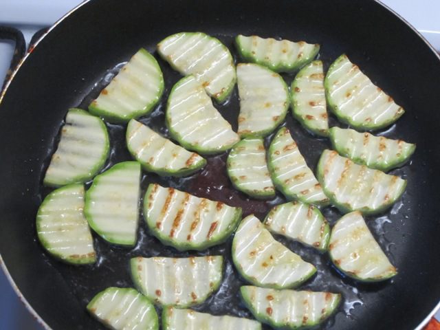 Кабачок вымыть, обсушить, нарезать полукруглыми ломтиками фигурным ножом. Обжарить на растительном масле в течение 5 минут.