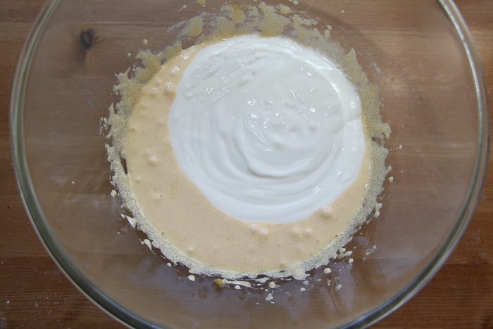 К яичной смеси добавить йогурт (или некислую сметану 10-15%).