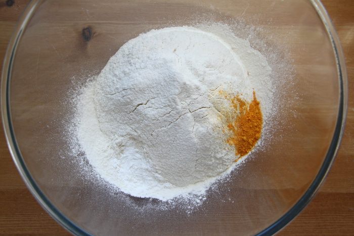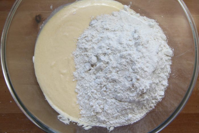 Соединить жидкую смесь с мукой.