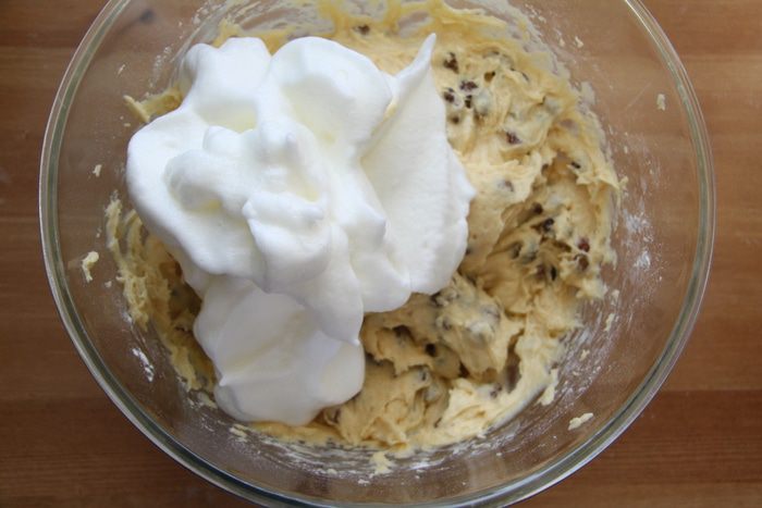 Белки взбить с лимонным соком до устойчивых пиков. Движениями сверху вниз спатулой аккуратно перемешать взбитые белки с тестом до однородного состояния.