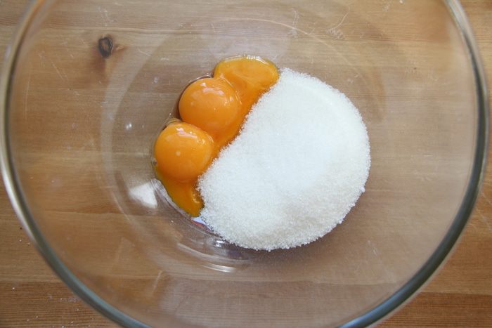 Яйца разделить на белки и желтки. Желтки растереть с оставшимся сахаром добела.