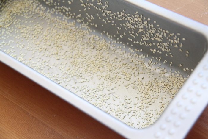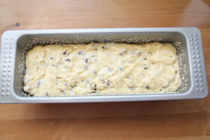 Форму для кекса (в оригинале была круглая с отверстием, у меня прямоугольная, кирпичиком) слегка смазать сливочным маслом, обсыпать кунжутом.