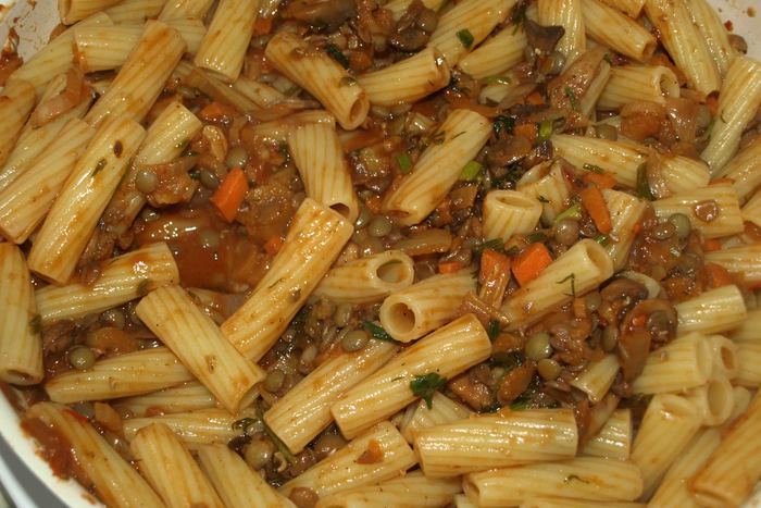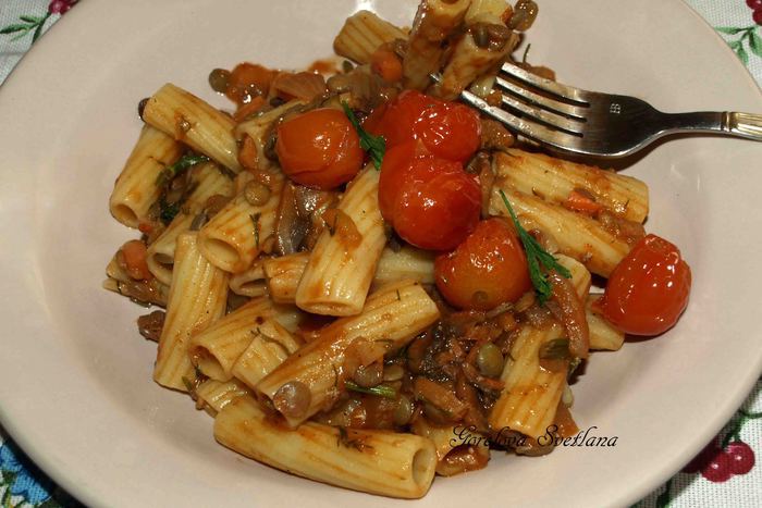 Тортильони отварить, как указано на пачке производителя, воду слить в чистую посуду. Добавить к чечевично-томатному соусу 200 мл воды, в которой варились тортильони. Добавить тортильони и томить минуты 2-3.