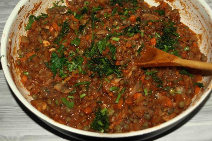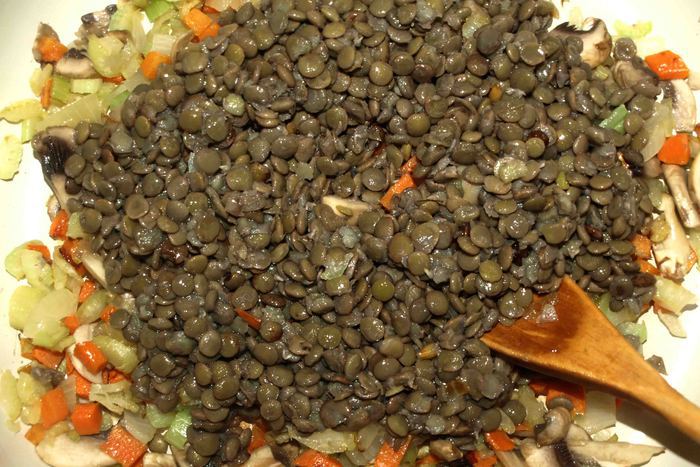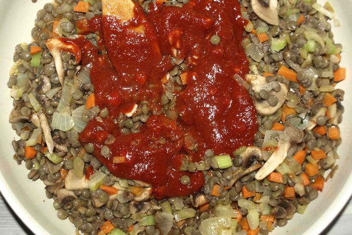 Добавить соус к чечевице.