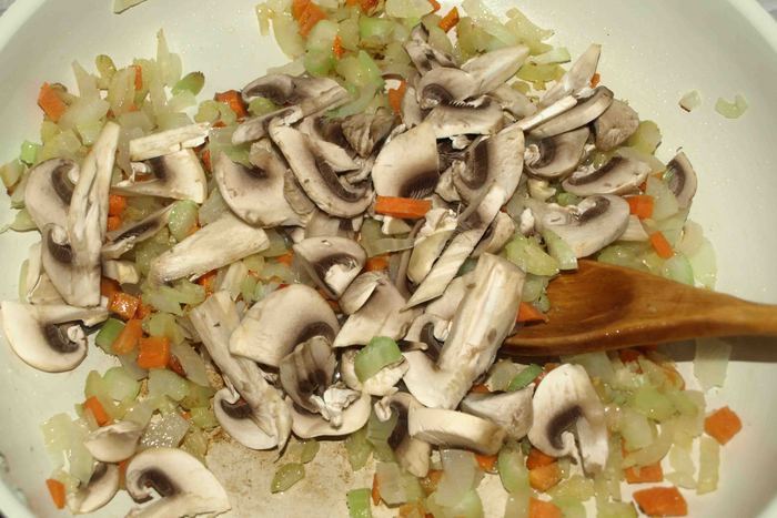 Добавить нашинкованные пластинами шампиньоны.