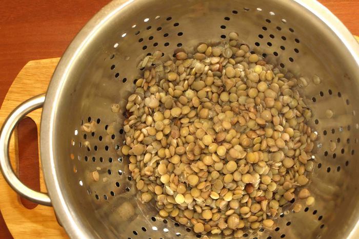 Добавить зеленую чечевицу (в ингредиентах указано количество вареной чечевицы).