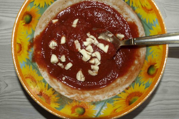 В томатную пасту добавить сахар, соль, лимонную кислоту, чеснок, сванскую соль, перец, аджику, 4 ст. ложки воды. Перемешать.